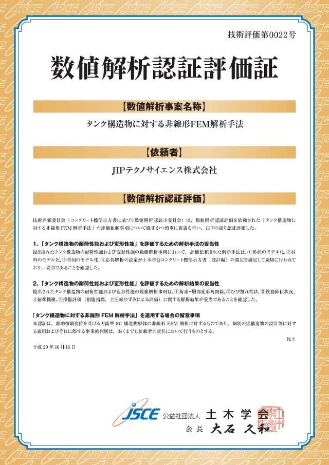 平成29年10月16日に、弊社が実施した『タンク構造物に対する非線形FEM解析手法』が、公益社団法人土木学会技術評価制度 区分5※1で、初の技術評価証を取得しました。