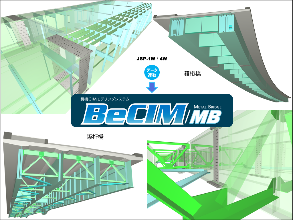 また、平成28年度には、鋼橋CIMモデリングシステム「BeCIM/MB」をリリース。概略自動設計シリーズ「JSP-1W/4W」のデータを連係し、鈑桁橋、箱桁橋の上部工CIMモデルを瞬時に自動生成する画期的なシステムで、超高速なモデリングと充実した部材表現を実現しました。