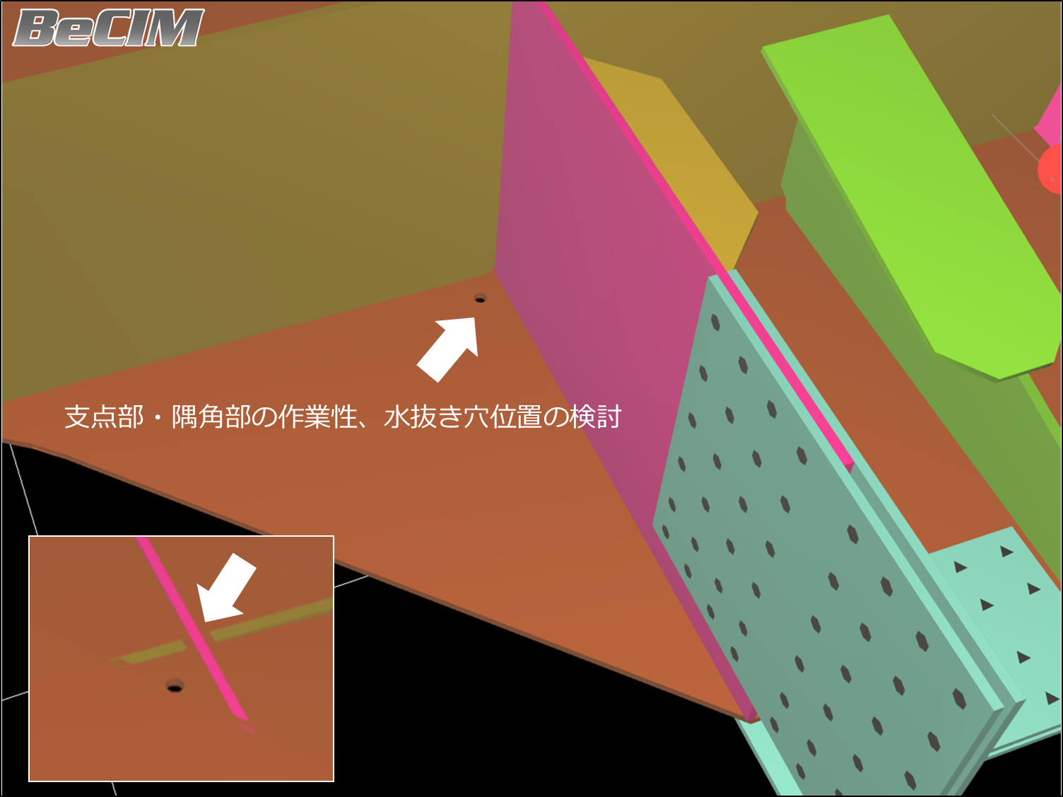 設計品質の向上として注目される構造物の干渉確認や施工計画シミュレーションおよび動画表現など、業界トップクラスの実績を有します。製作、施工においては、PC橋のコンクリートの流動性に関する見える化や、鋼橋の支点部・隅角部の製作作業性の向上として、溶接可否や水抜き穴位置の検討、およびCIMモデルの3Dプリンタ出力への対応実績などがあります。