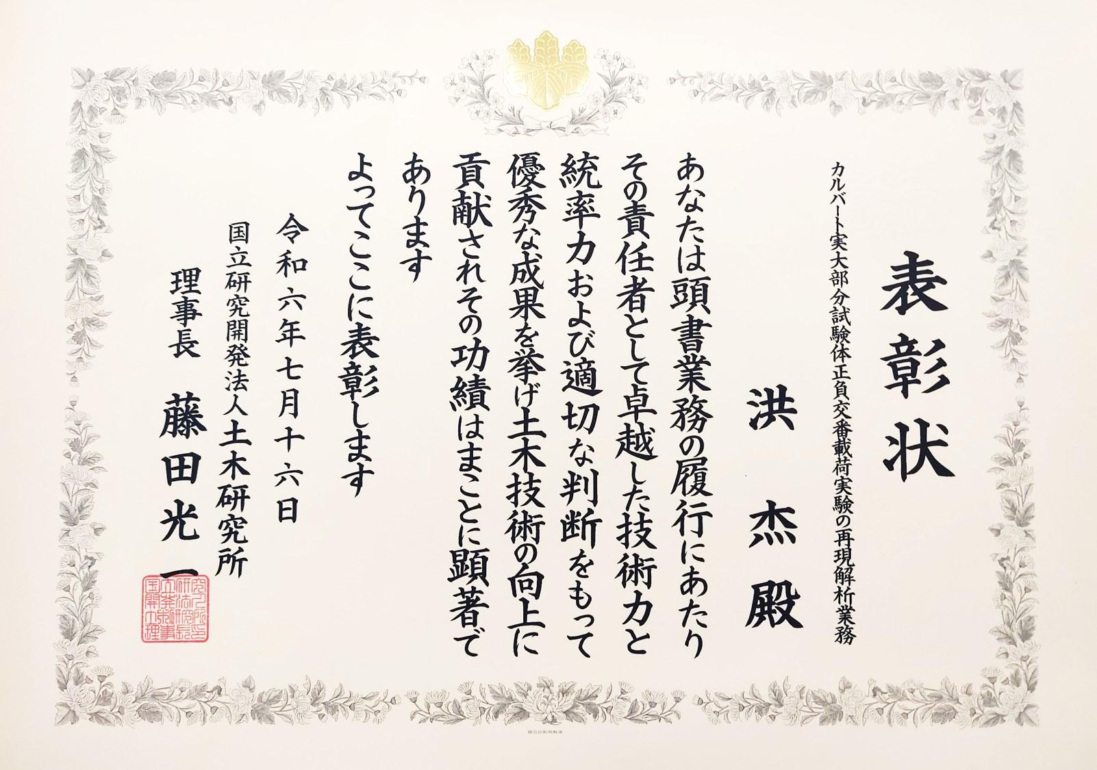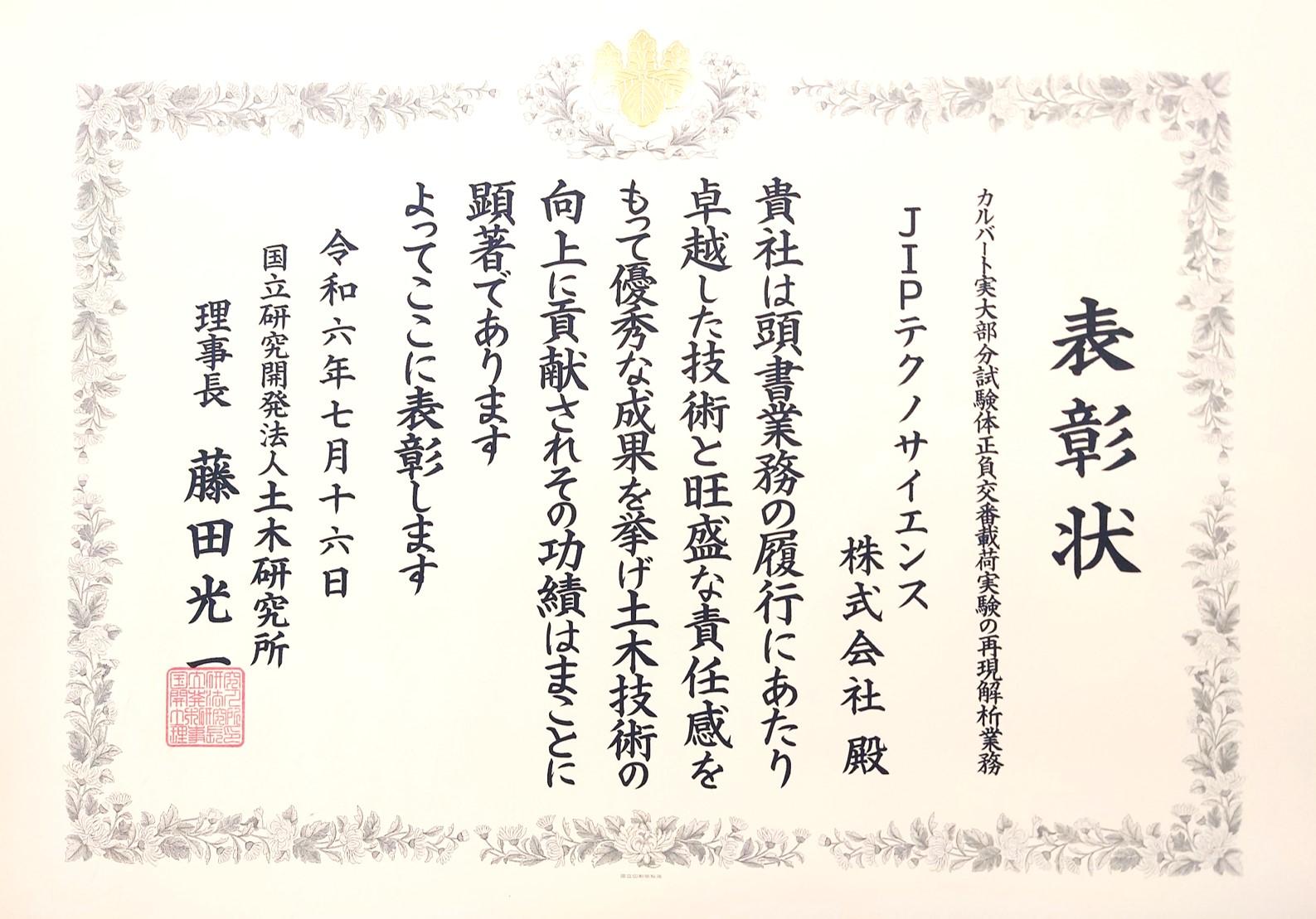 国立研究開発法人土木研究所(以下、土木研究所)から令和5年度に受託した業務において、当社および当社社員が、その成果および業務への取組みが特に優良であった受注者及び技術者として表彰されました。