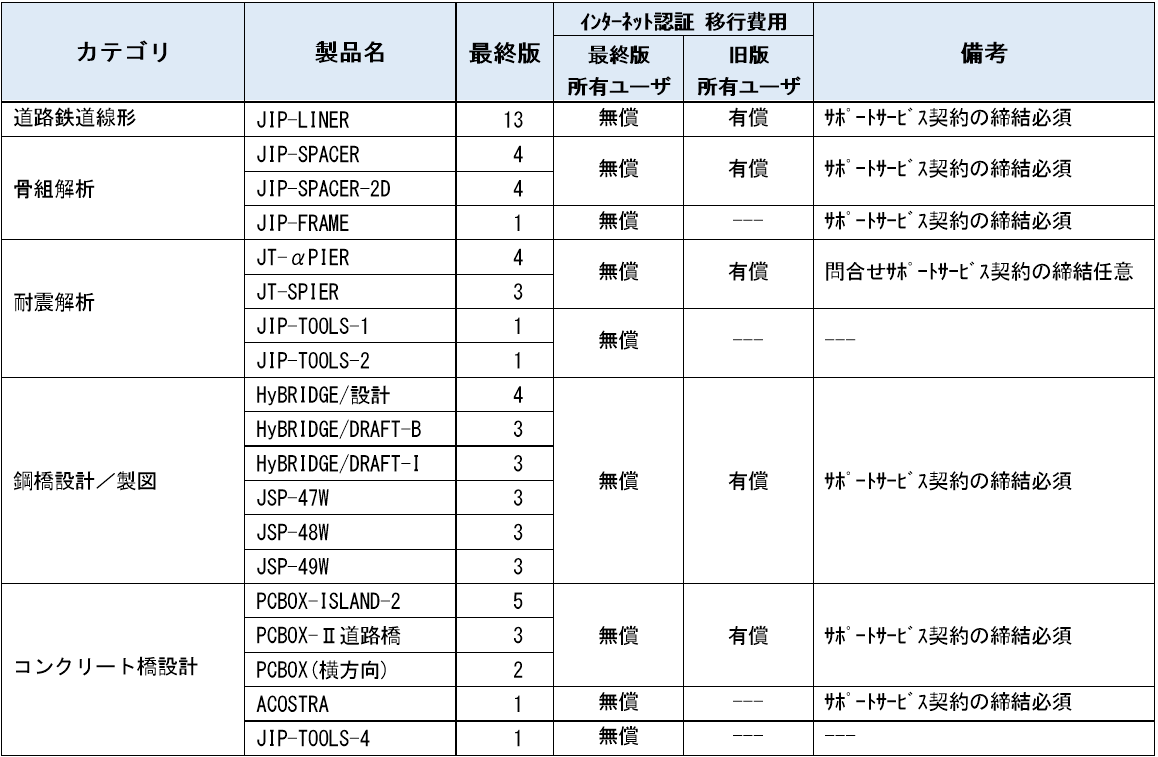 - JT-αPIER, JT-SPIERについては、問合せサポートサービス契約の締結が任意の製品です。JT-αPIER, JT-SPIERに限り、問合せサポートサービス契約の締結有無にかかわらず、インターネット認証版への移行は、無償で対応させていただきます。なお、インターネット認証版への移行後も問合せサポートサービス契約の締結は任意となります。