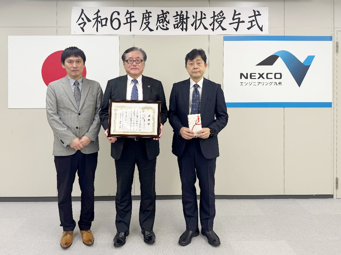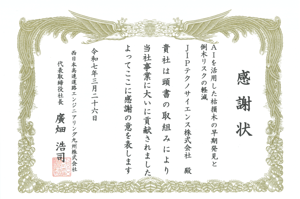 令和7年3月26日、西日本高速道路エンジニアリング九州株式会社様本社にて、「AIを活用した枯損木の早期発見と倒木リスクの軽減」に関して、弊社が感謝状を授与されました。