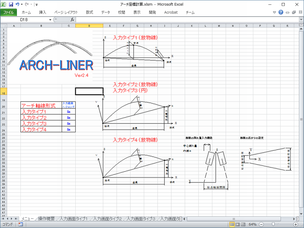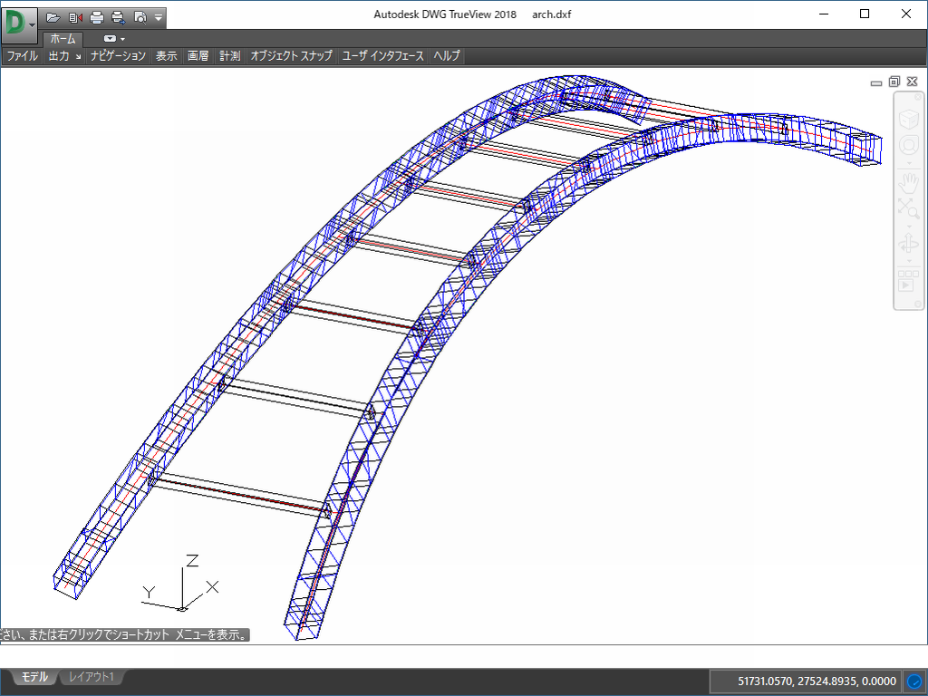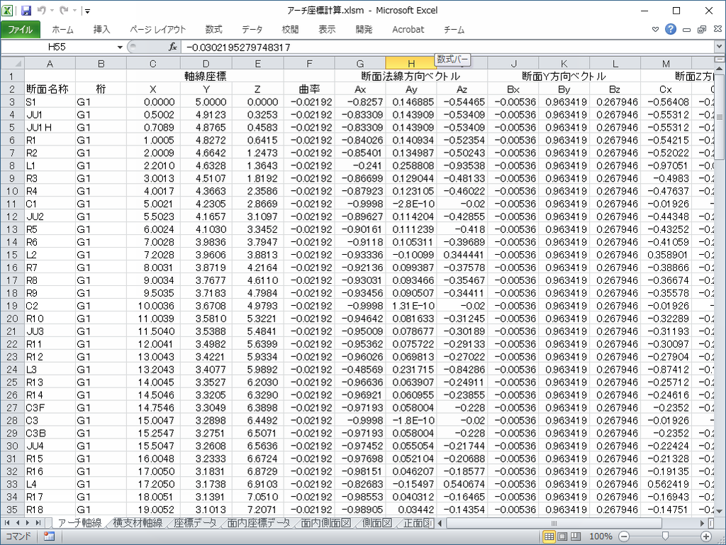 アーチの上弦材、上支材、下弦材、横桁位置の完成時・仮組時座標を計算し、Excelシートに出力できます。軸線データ、断面寸法データ、計算ポイントの位置指定、および属性データを入力し、画面上の実行ボタンをクリックすることにより、Excelシートに完成時・仮組時座標が出力できます。