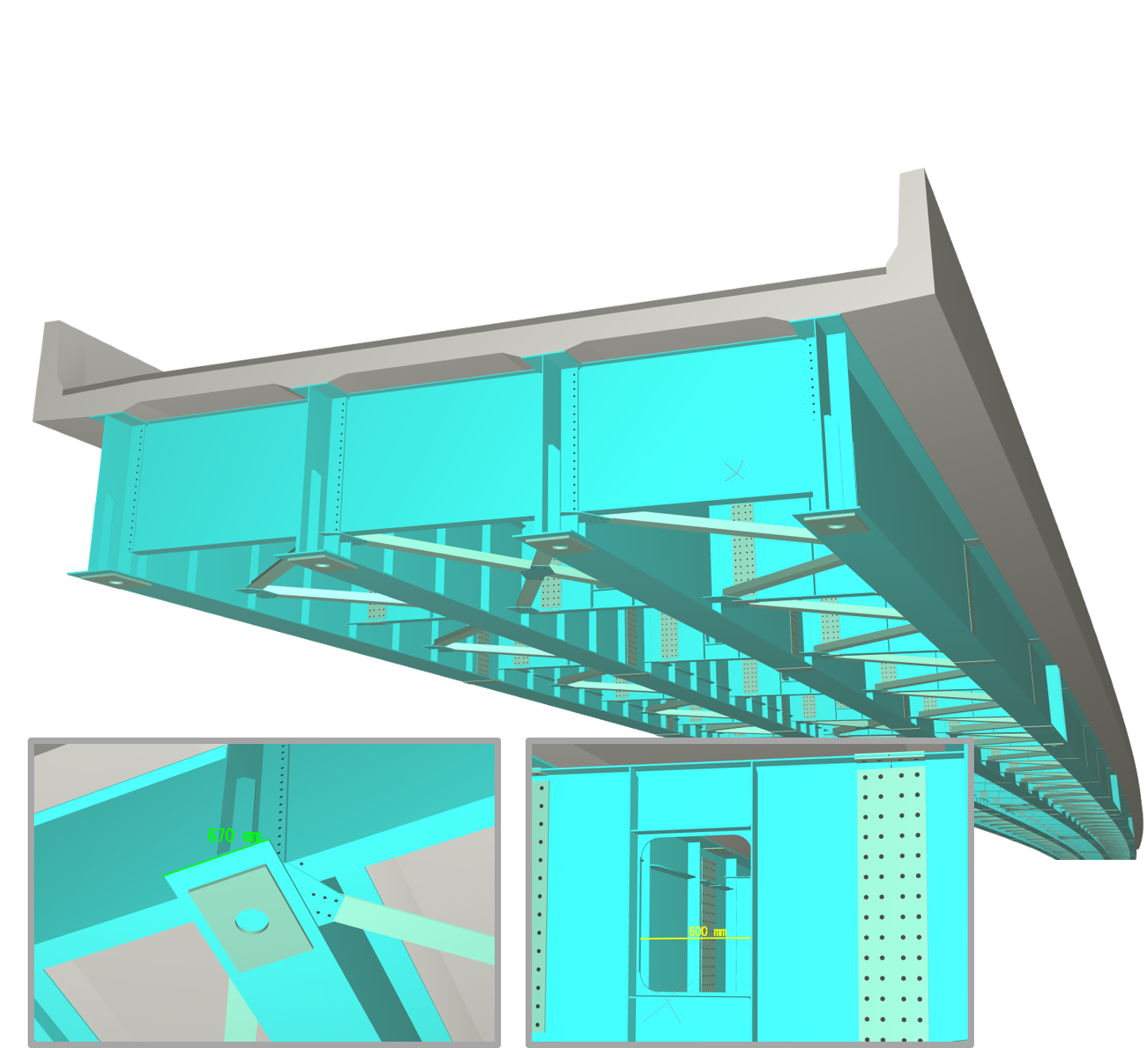 1) 支点周りの部材を考慮した詳細度の高いモデルが出力できます。また付属物モデルとして排水装置、検査路にも対応しており主構造との干渉チェックの実現、さらに付属物の配置計画にもご利用できます。 2) 作成した部材から3次元数量を算出し、「まてりあるEX」(鋼構造物の材料計算 拡張版)および「まてりある」(鋼構造物の材料計算)へ連動することで数量計算書を作成できます。 <概略モデリング>
