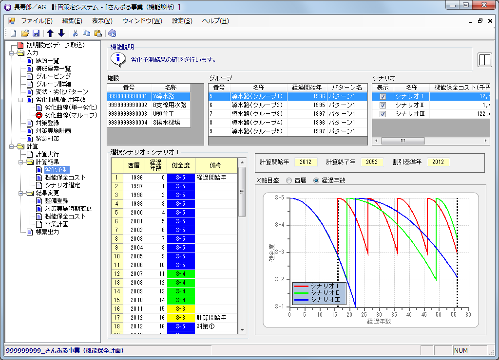• 対策実施時期や対策工法、対策後の回復健全度等が自由に設定でき、多彩なシナリオが作成できます。