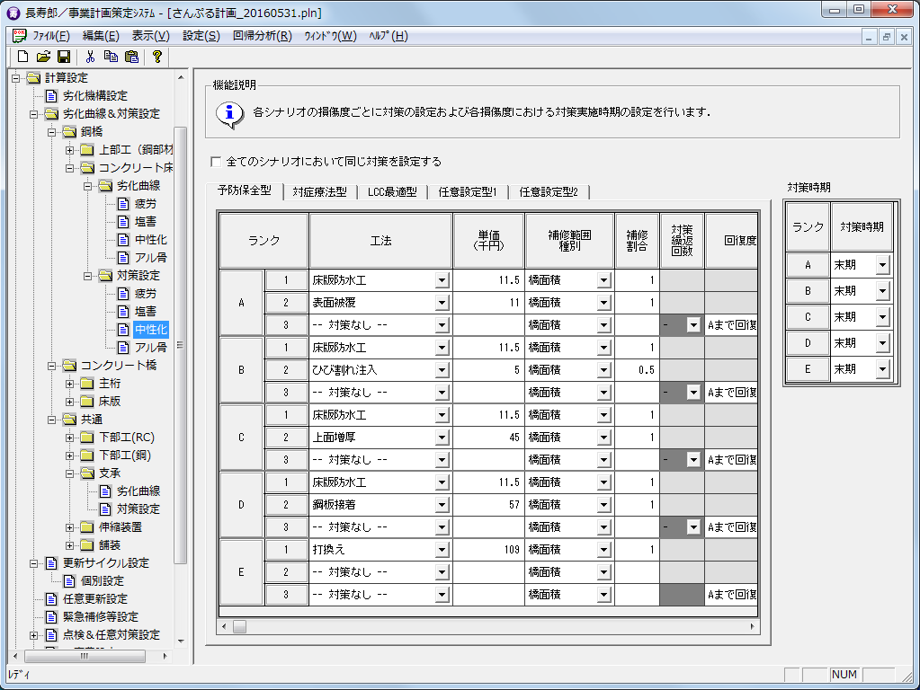 - シナリオは予算制約や工法選択など多彩な設定が可能です。