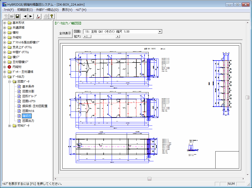 鋼桁橋設計システム(HyBRIDGE/設計)より線形データと設計データを連動し、スピーディーに閉断面箱桁と鋼床版箱桁の図面ファイルと材料データを作成するシステムです。