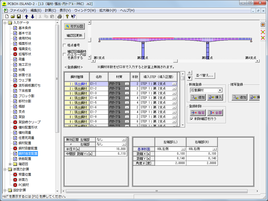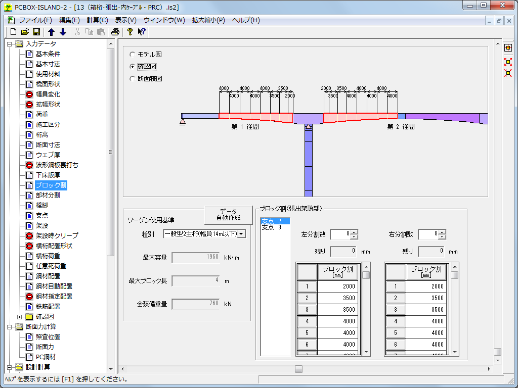 • 各種技術資料に従い、桁高、断面寸法、張出架設時のブロック割・架設ステップ・架設機材などの自動設定が行えます。