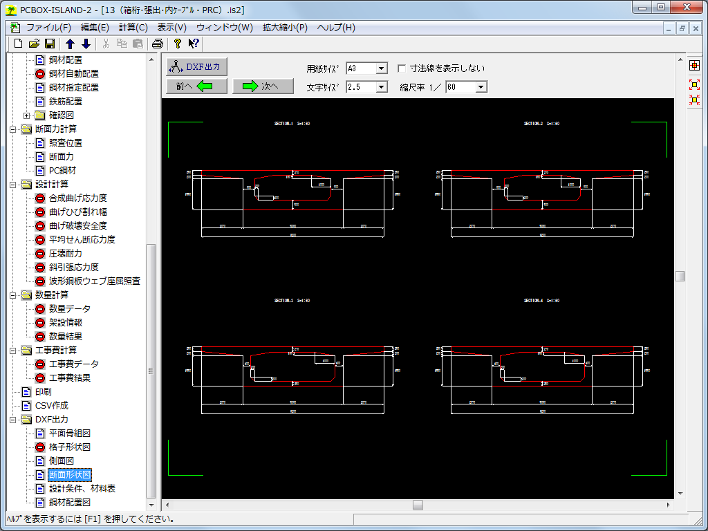 • 設計条件、各種確認図、断面力計算結果、断面力図、設計計算結果、数量・工費など多様な帳票出力に対応しています。