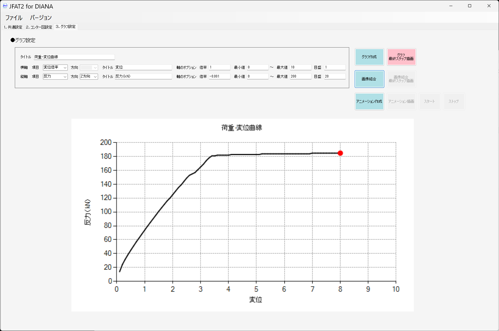 • 荷重変位曲線とコンター図を描画したアニメーションの作成が可能です。