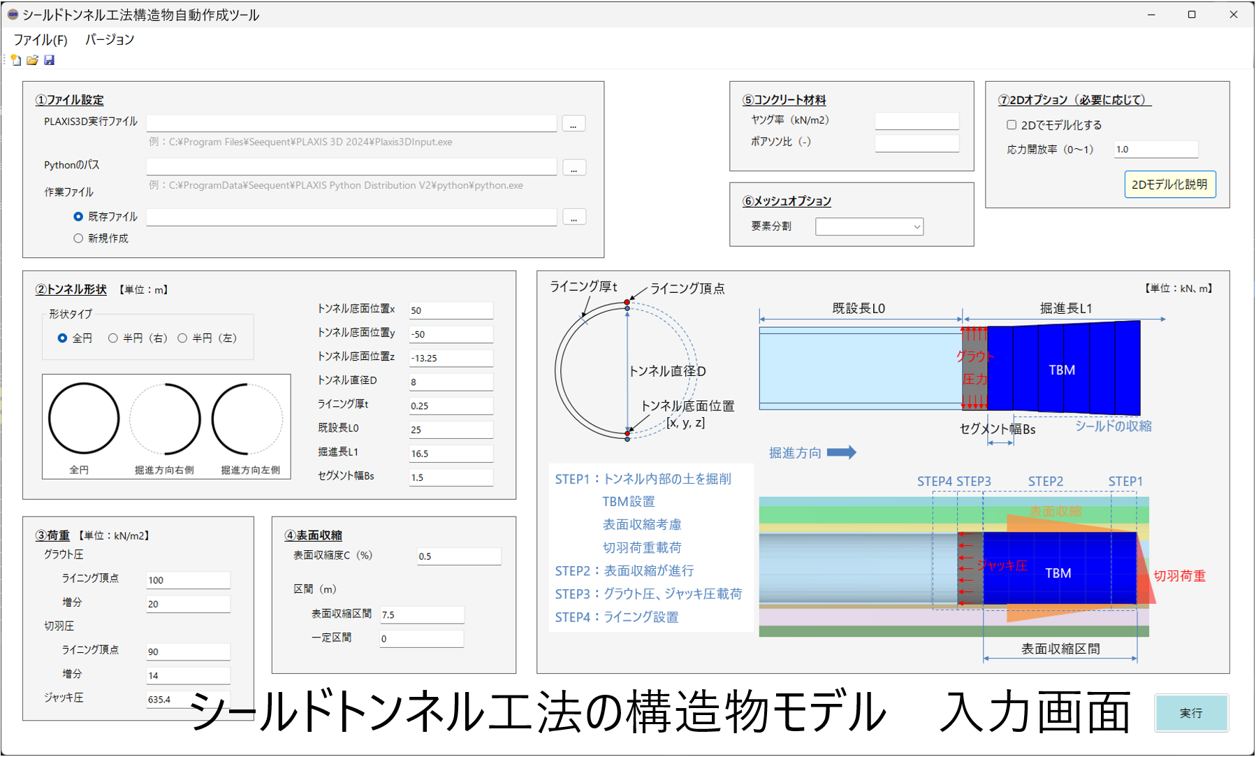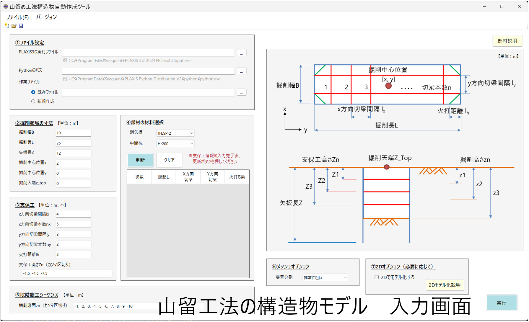 - 掘削領域の寸法、支保工の間隔・本数の入力で、構造物モデルを自動作成