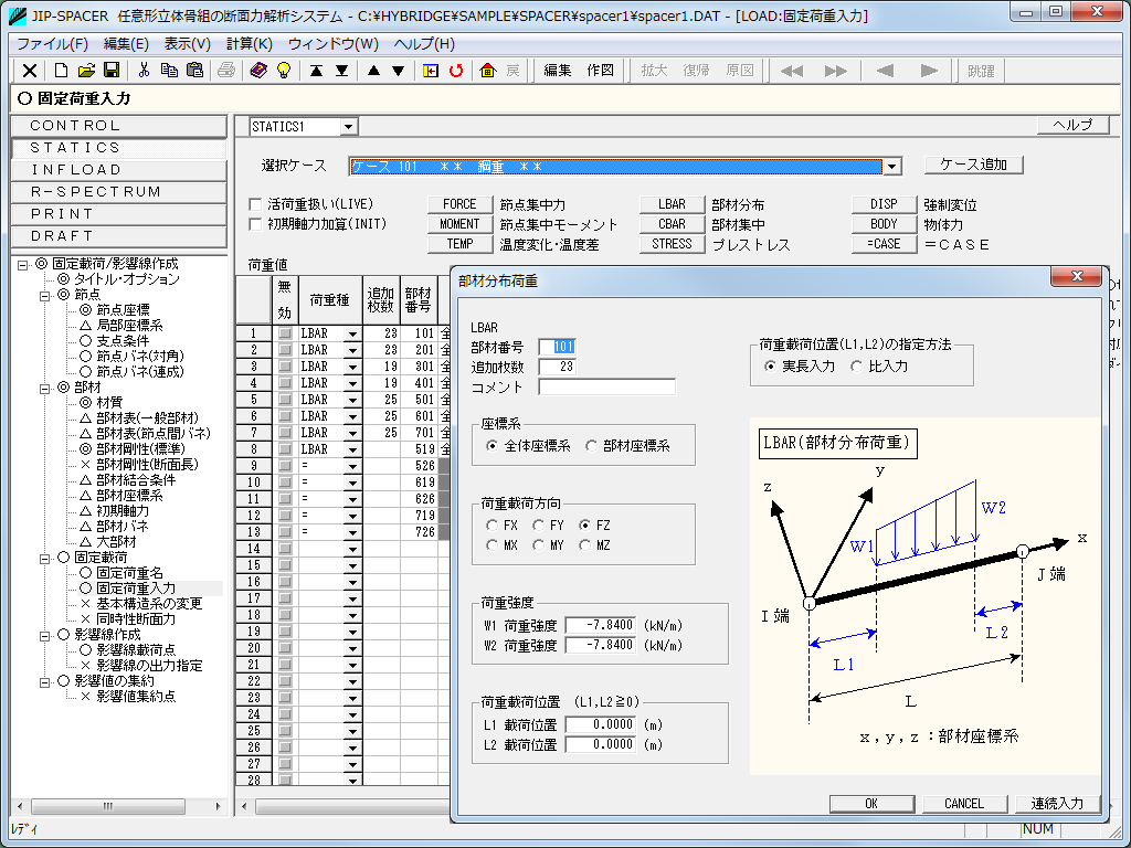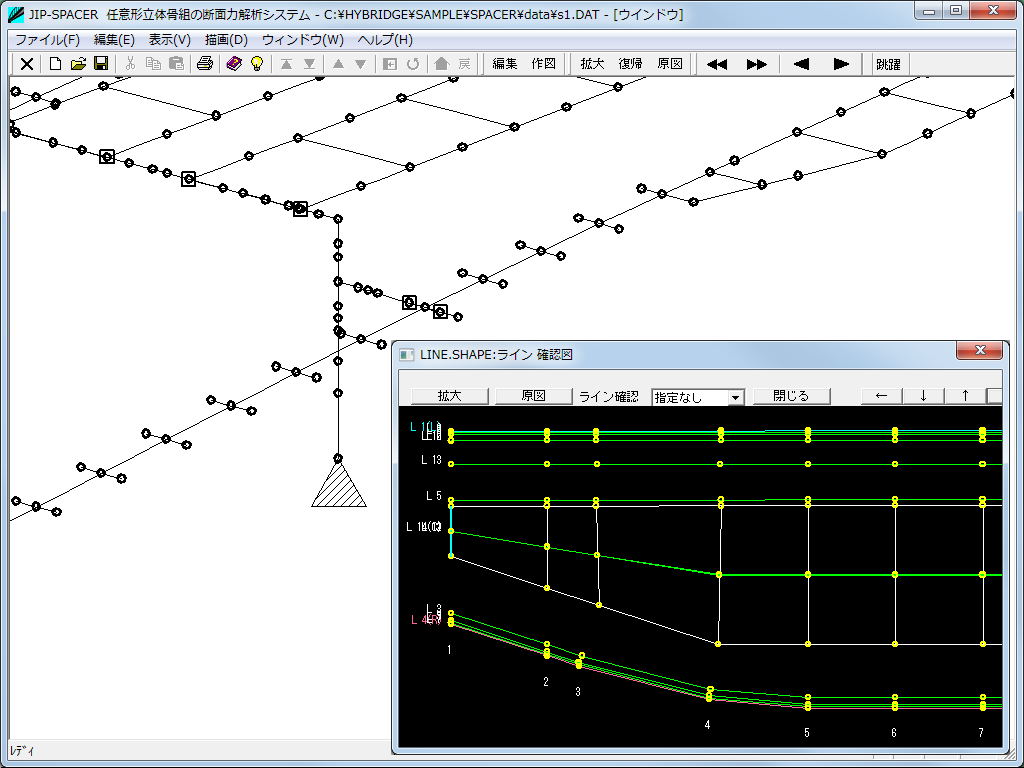 1節点あたり6自由度を持つ任意形立体骨組の微小変形理論による静的・動的断面力解析システムです。特に橋梁構造物におけるさまざまな固定載荷や影響線載荷計算に対応しています。