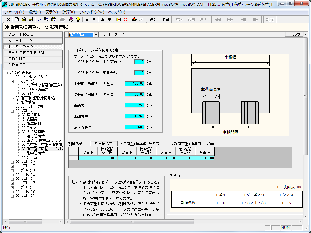 影響線載荷は橋面の死荷重と活荷重(道路橋示方書準拠のA,B活荷重、T活荷重、群集荷重)、鉄道橋向けの連行荷重に対応しています。
