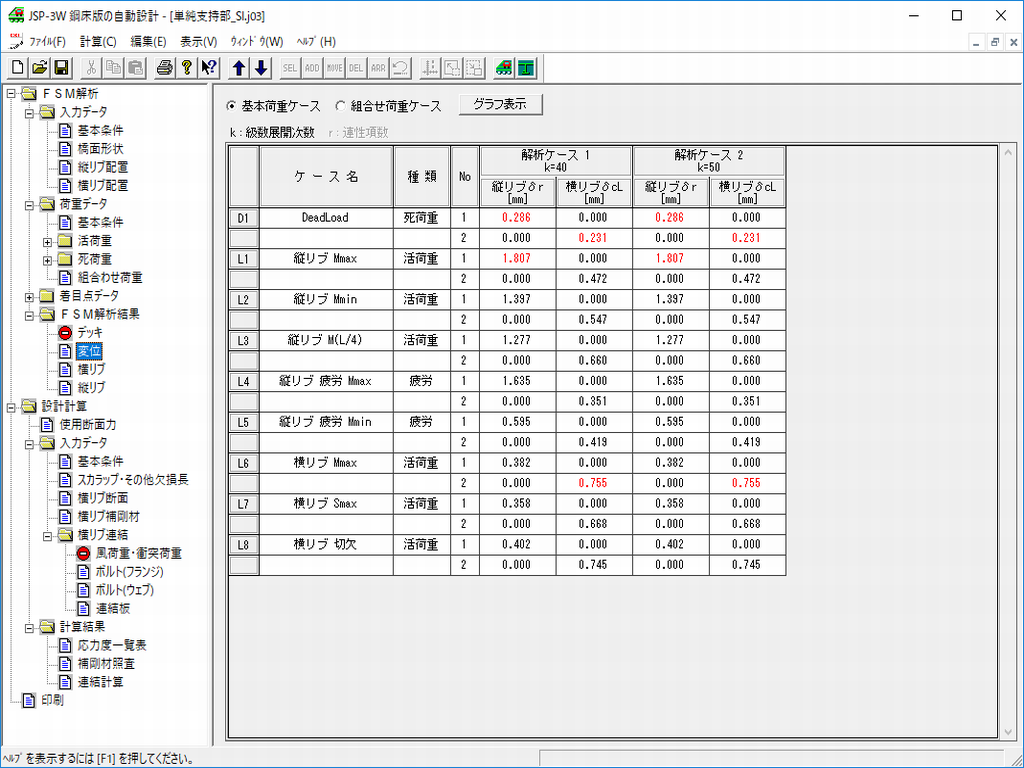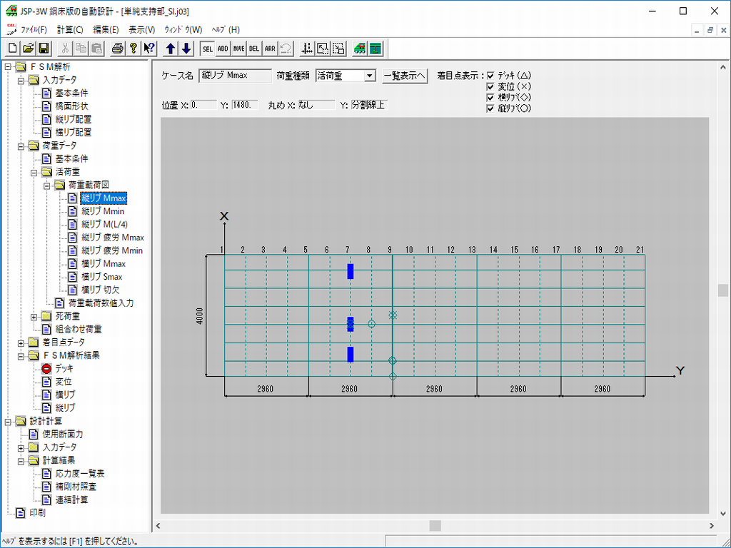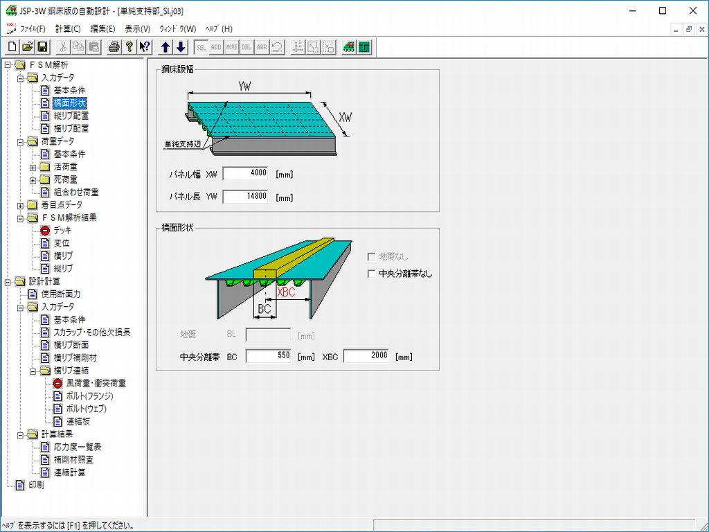 道路橋示方書・同解説Ⅰ共通編、Ⅱ鋼橋・鋼部材編に基づき、縦リブ、横リブ、鋼床版の設計を自動的に行います。断面力算出の解析方法は、有限帯板法(FSM)により計算します。