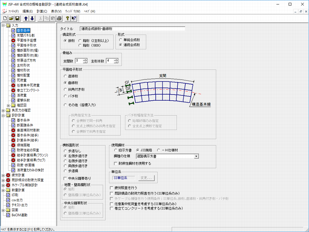 道路橋示方書・同解説Ⅰ共通編、Ⅱ鋼部材・鋼上部構造編に基づき、単純合成鈑桁、単純合成箱桁(RC床版)の概略設計(断面力算出、耐荷性能照査、疲労照査、数量計算、工数積算)を一貫して行えます。また、本製品には連続合成桁オプションA(鈑桁・開断面箱桁)、連続合成桁オプションB(閉断面箱桁)があります。