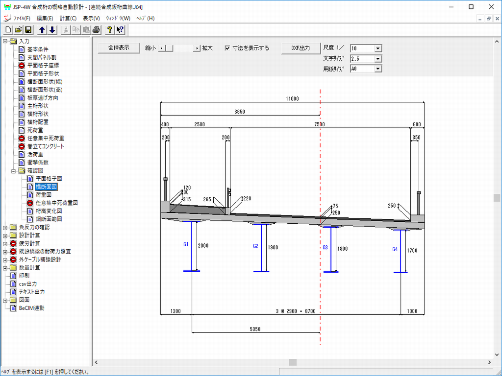 • 平面格子図、横断面図、荷重図、桁高変化図、構造一般図などをDXFファイルに出力が可能です。