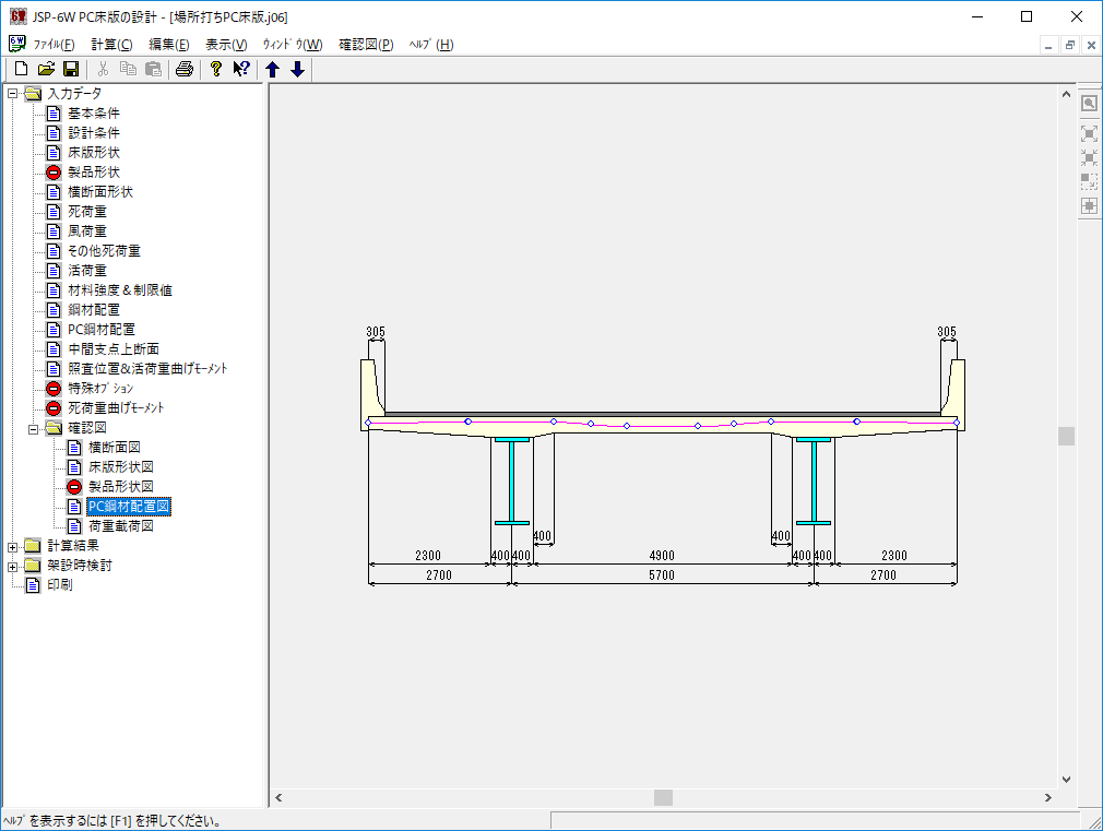 道路橋示方書・同解説Ⅰ共通編、Ⅱ鋼橋・鋼部材編、Ⅲコンクリート橋・コンクリート部材編に基づき、鋼少数主桁形状のプレートガーダー橋に用いるPC床版の橋軸方向および橋軸直角方向の設計が行えます。なお、本プログラムでは橋軸直角方向をPC・PRC構造、橋軸方向をRC構造として設計される床版を示します。