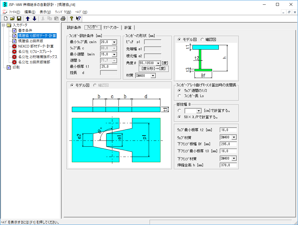• フィンガープレートの形状やフランジ、ウェブの断面決定は自動計算、指定計算が可能です。