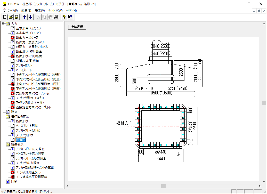 - アンカーボルト、アンカービーム、ベースプレートの断面は自動決定と指定計算が可能です。