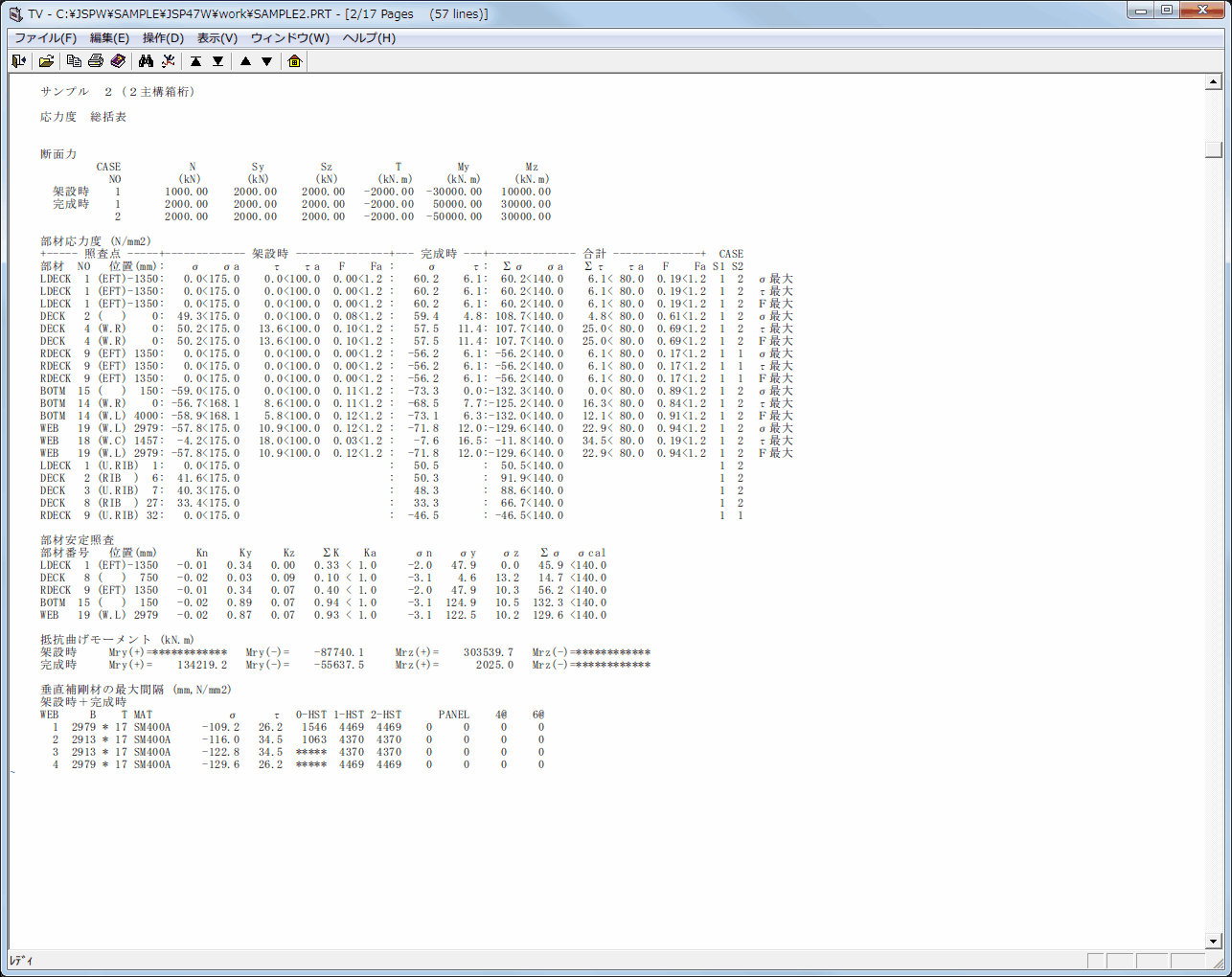 - 張出し部落とし込みデッキの板重ねを考慮できます。架設時、完成時の各断面力による応力度を加算して総括表示、詳細表示ができます。