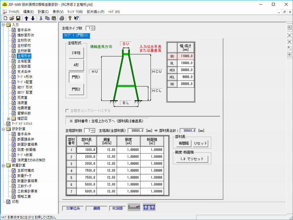 - 主塔形状は1面ケーブル(1本柱、A形)、2面ケーブル(2本柱、A形、門形)に対応しています。