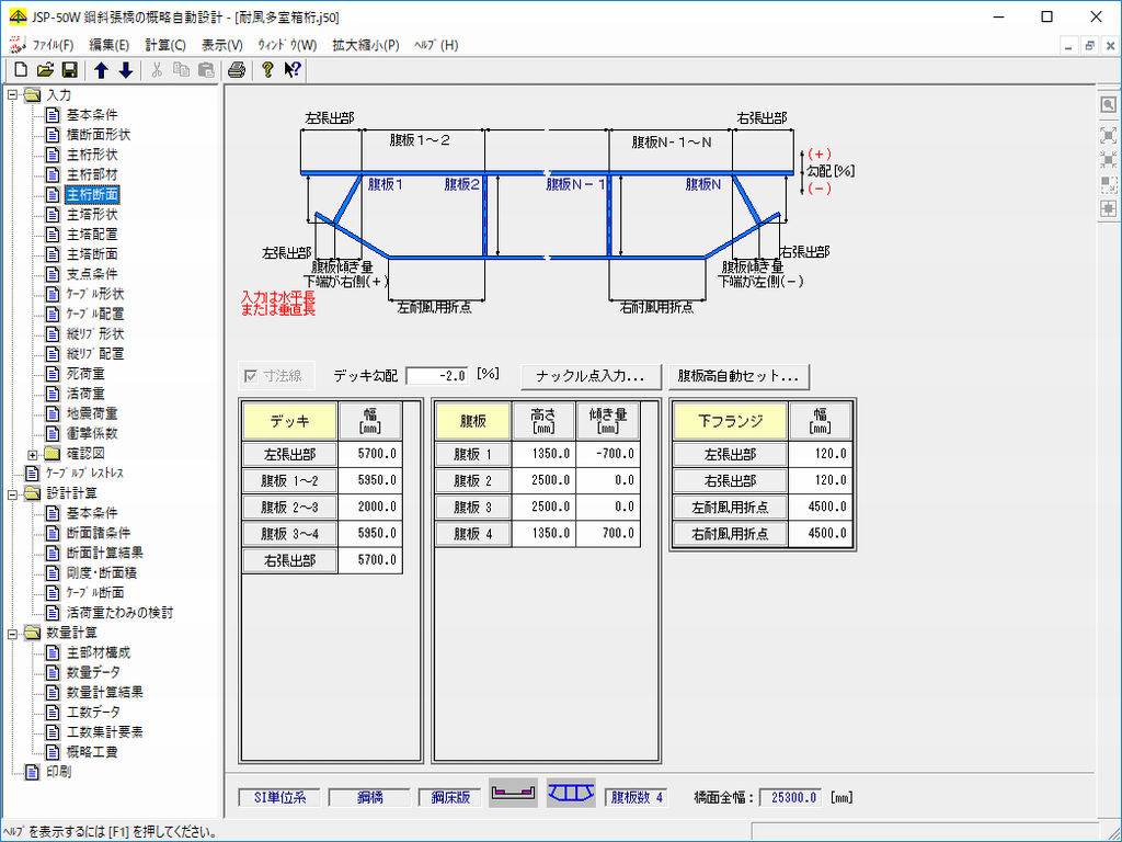 - 主桁のデッキ形状はナックル点、勾配を、腹板は傾斜の設定が可能です。