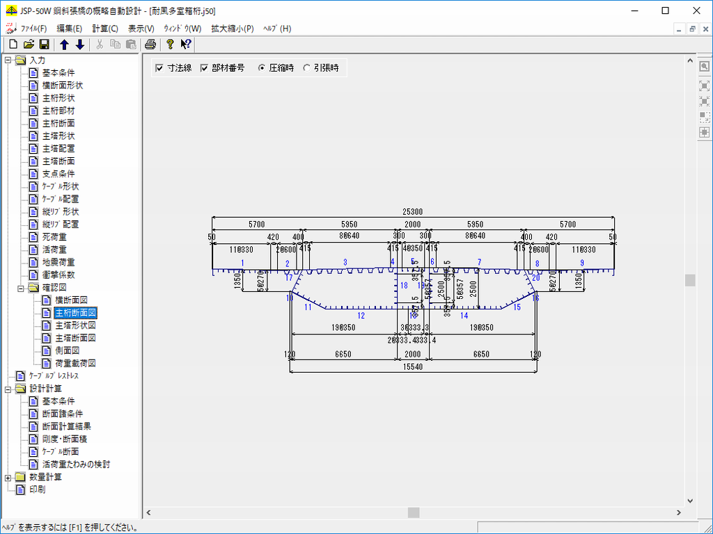 - 主桁断面形状はRC床版(鈑桁2主桁、箱桁1主桁、箱桁2主桁)、鋼床版(鈑桁2主桁、箱桁1主桁、箱桁2主桁、多室箱桁、耐風多室箱桁)に対応しています。