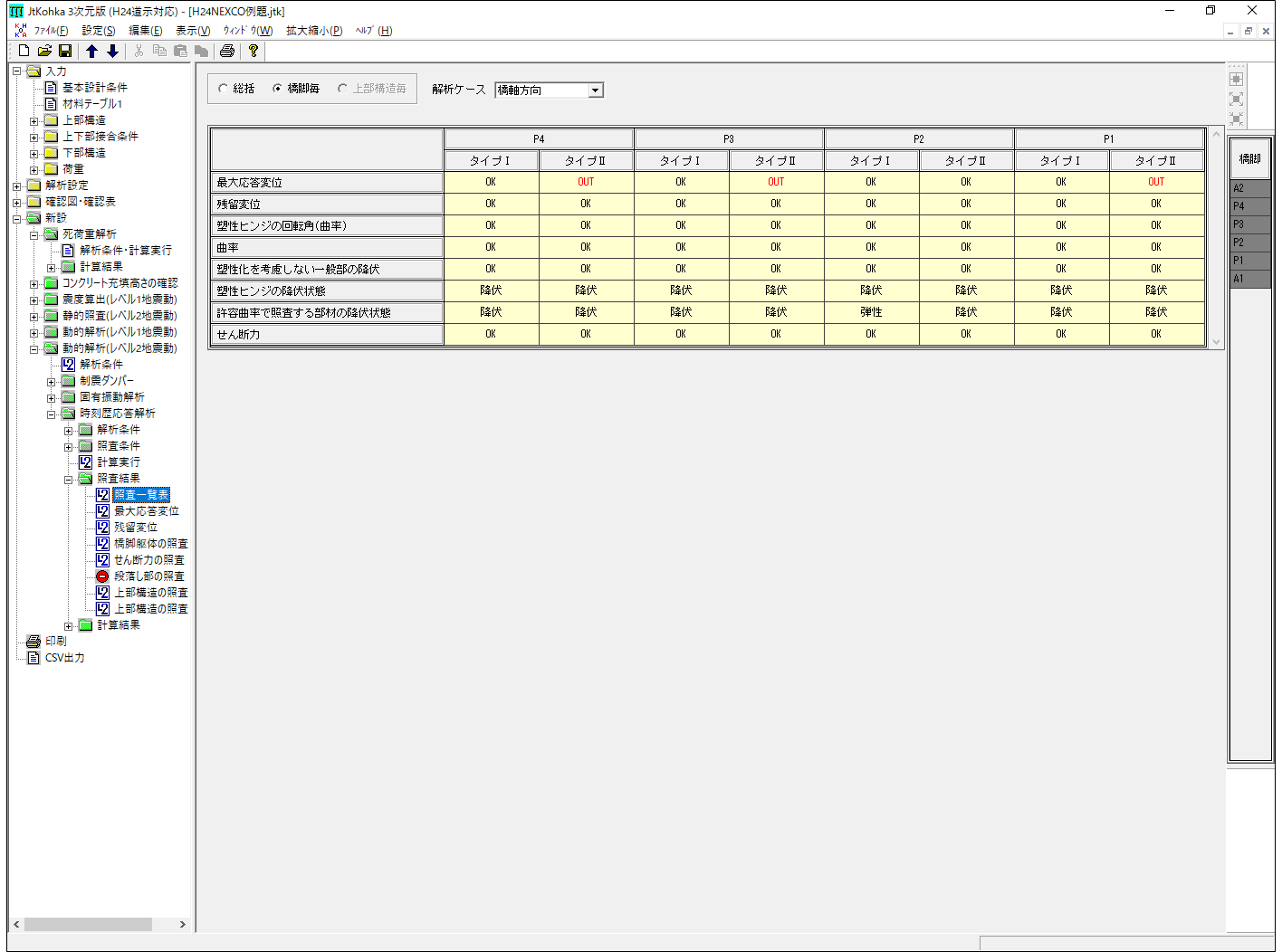 - ラーメン橋では橋全体系のプッシュオーバー解析による固有周期、終局震度、水平変位の制限値算定、破壊形態の判定が行えます(2次元モデルで1連をモデル化した時のみ)。