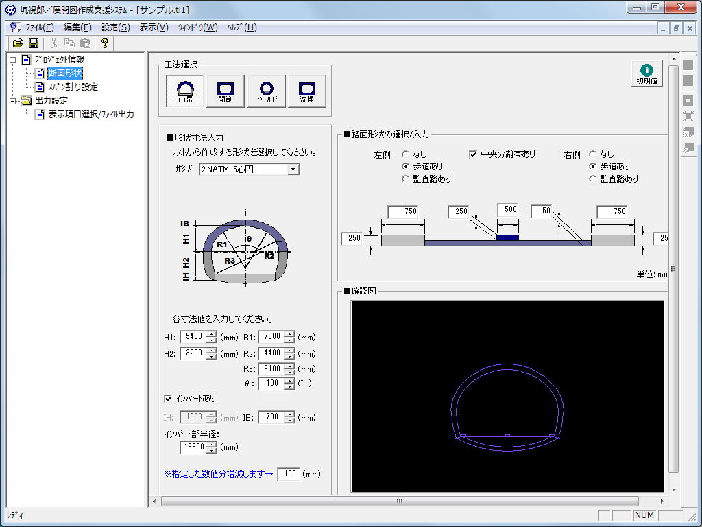 • トンネルの基本諸元を入力すれば、変状を書き込む下図作成が可能です。