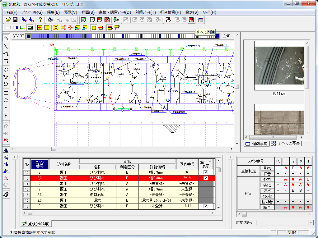 トンネルの定期点検要領に沿った目視点検業務を支援するものです。展開図作成、変状データの記録、点検後のデータまとめ作業を効率的に行うことができます。