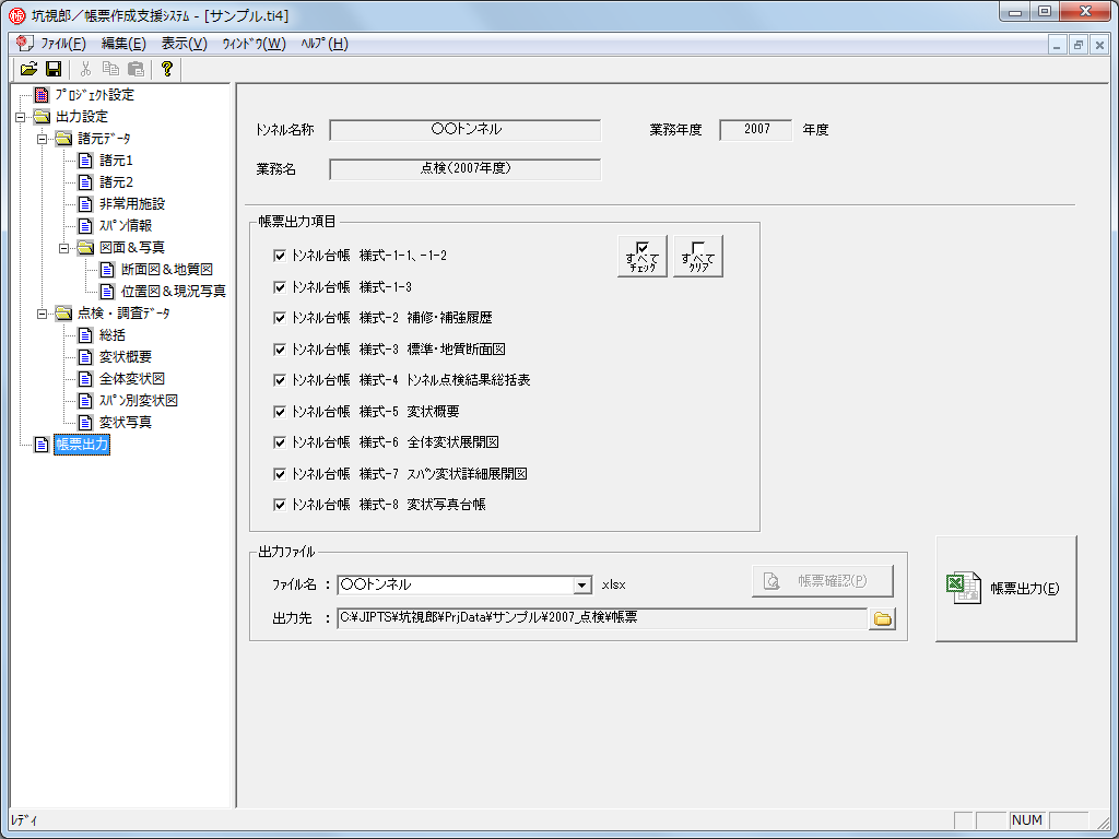 • 道路トンネル点検・補修の手引 平成13年7月(近畿地方整備局版)の点検調書をMicrosoft Excel形式で出力が可能です。