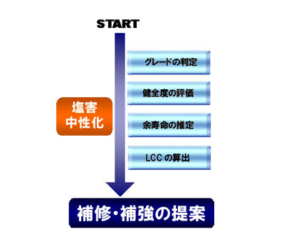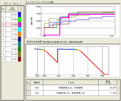 BMCEは、すでに対策が必要と思われる橋梁、あるいは、今後対策が必要と思われる橋梁を抽出し、個別の橋梁ごとの点検・調査結果を利用して、メンテナンスプランを策定し、ライフサイクルコストを考慮した補修・補強工法を管理者に提案することができるシステムです。