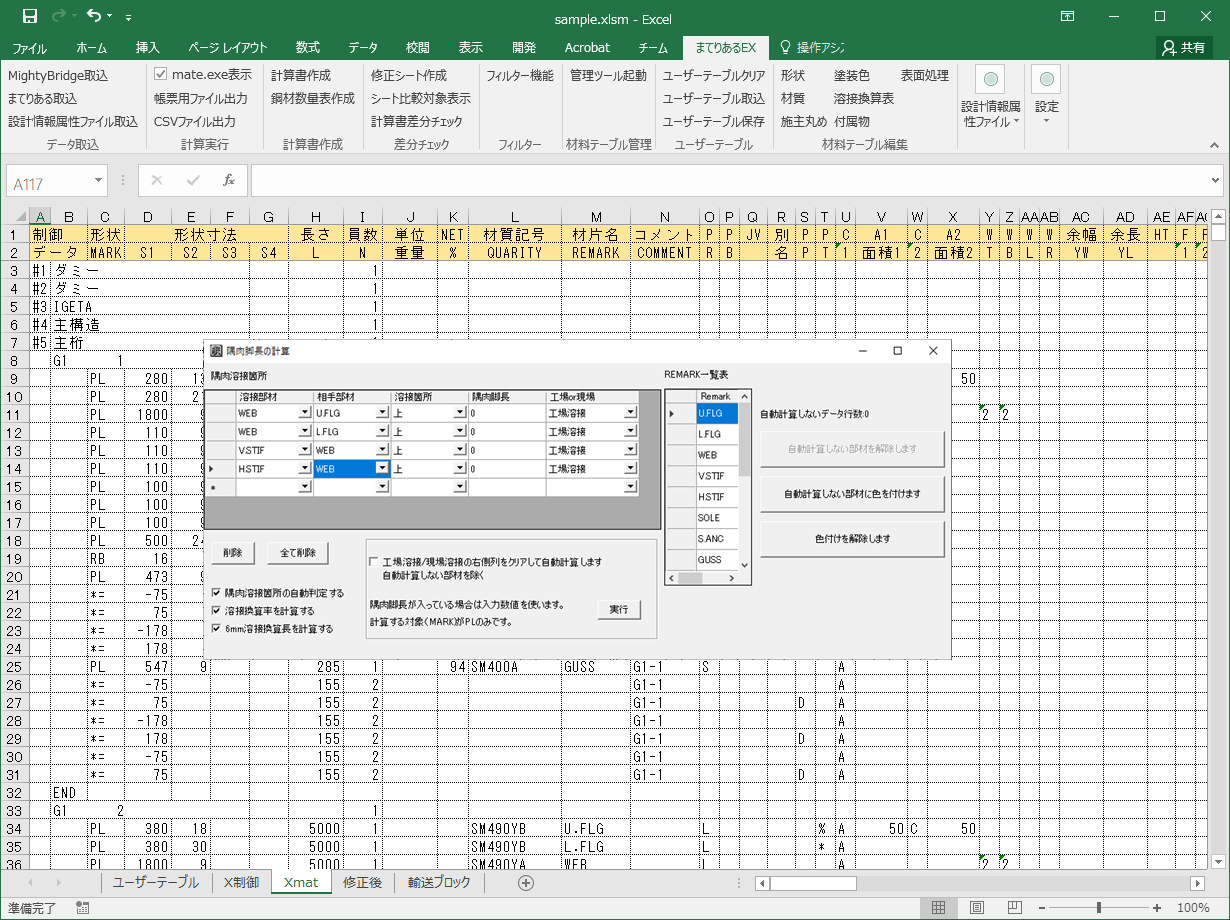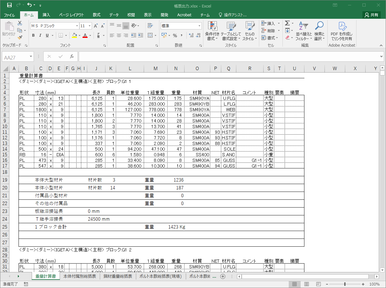 計算書:重量、塗装総括表:鋼材重量、塗装、ボルト本数、メッキ材料本体付属別、部材長さ集計表:工数算定要素、部署別本数、溶接継手延長、大型T継手溶接延長、工数算定ブロック重量表:ブロック、サイズ別