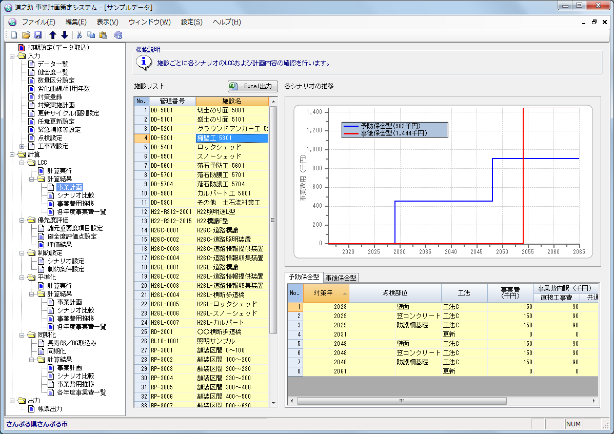 • 施設種別毎の健全度評価指標算出、劣化予測、LCC計算、予算平準化シミュレーションが可能です。