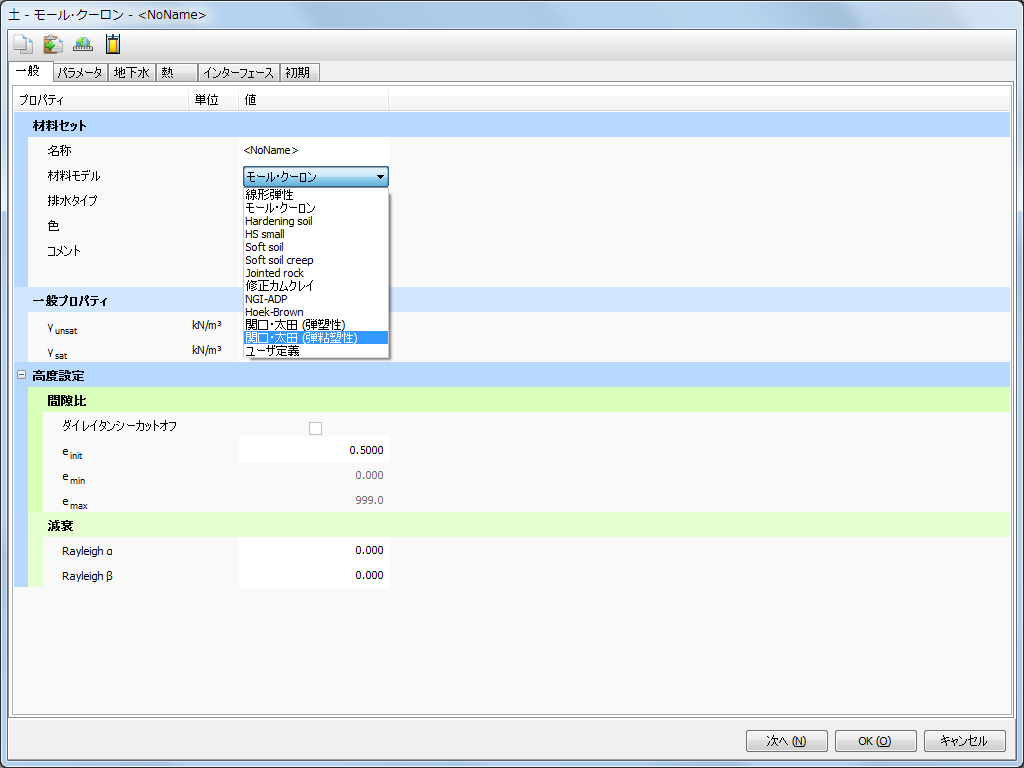 - 材料モデルは、線形弾性、モール・クーロン、Hardening Soil、HS Small、Soft Soil、Soft Soil Creep、修正カムクレイ、関口・太田(弾塑性/弾粘塑性)、PLAXIS液状化モデル、ユーザ定義モデル等が実装されています。