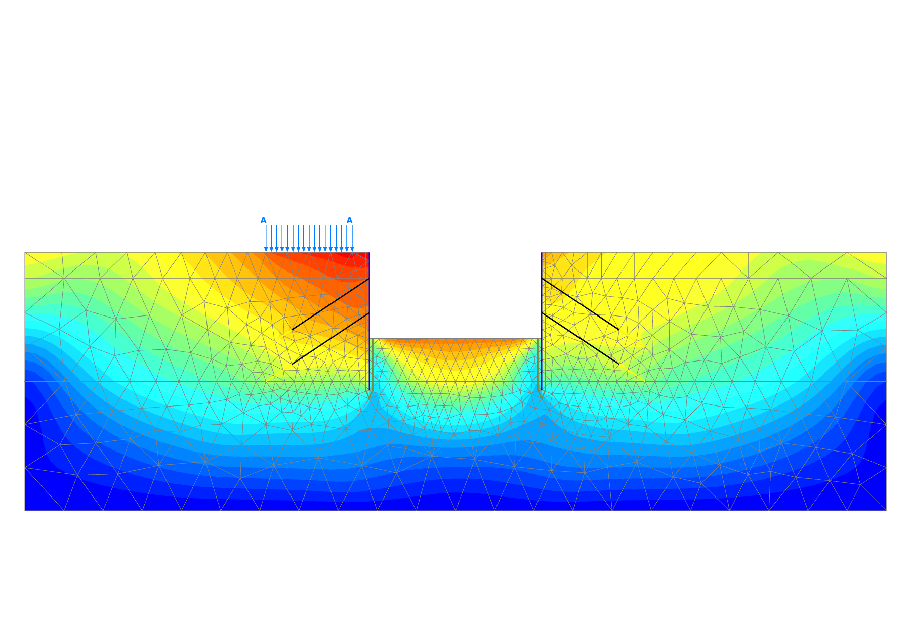 - 地盤は平面ひずみ要素または軸対称要素でモデル化します。6節点または15節点の三角形高次要素を用いることができます。