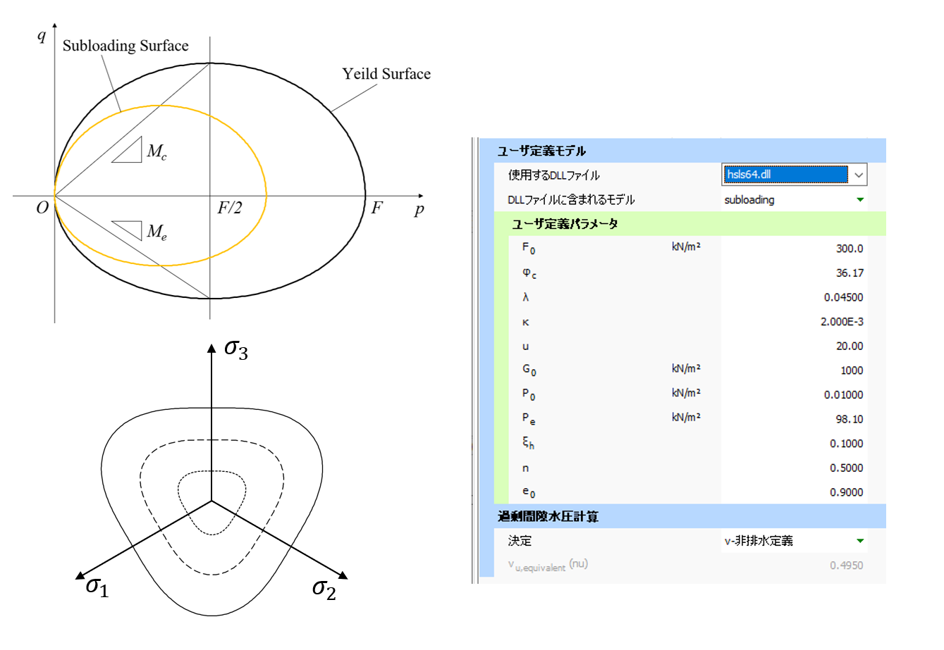 • HSLSモデルでは降伏面の内部に下負荷面を設けることにより、弾性域から徐々に塑性域に移行し滑らかな応力-ひずみ関係を実現します。