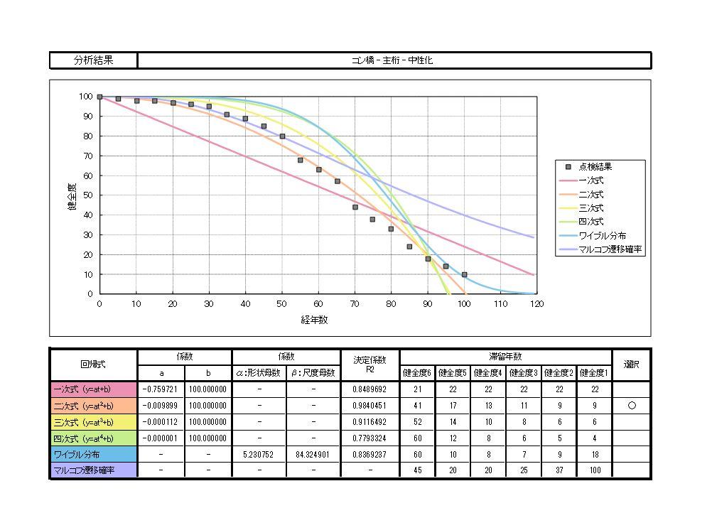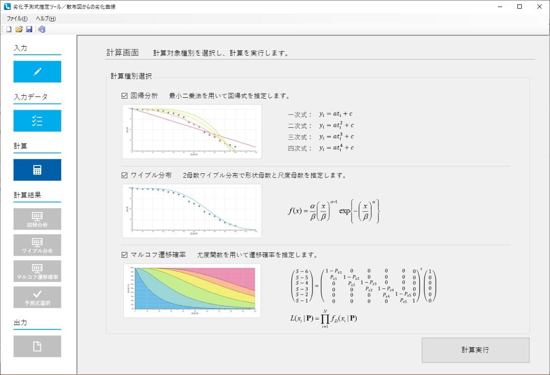 劣化予測式推定ツールは、特定の施設や部材などの構造物に依存せず、複数の理論・手法を用いた劣化予測式を作成します。また、作成した劣化予測式は容易に比較検討を行うことができ、簡単に劣化曲線の作成が可能です。