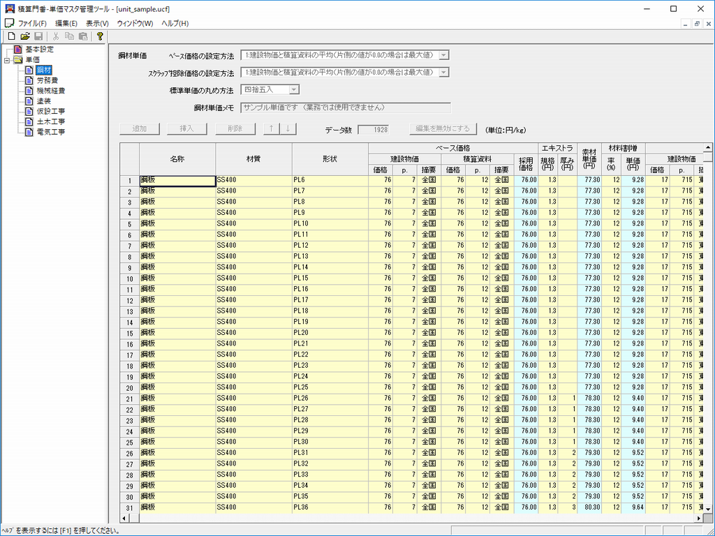 • 初期状態の単価ファイル(鋼材、労務費、機械経費、塗装費、土木工事費、電気工事費、仮設工事費)が付属しているため、カスタマイズが可能です。