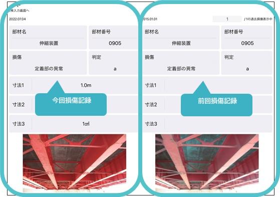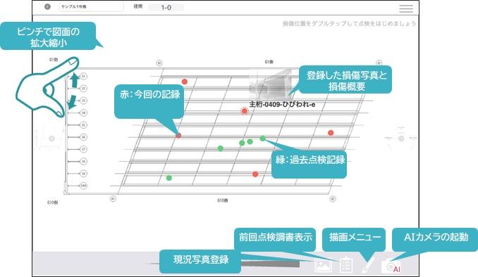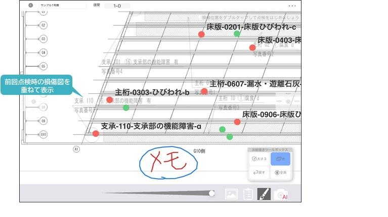 過年度の点検図面、損傷位置、損傷写真を下図として重ねて点検することが可能です。