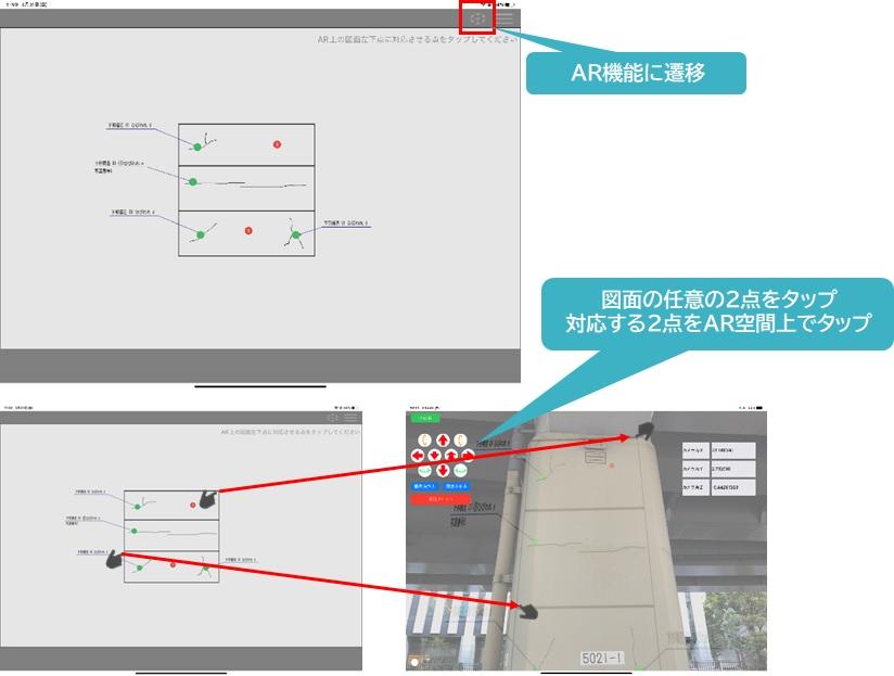 AR機能を用いて、過年度の損傷図をAR空間上に重ねて表示できます。