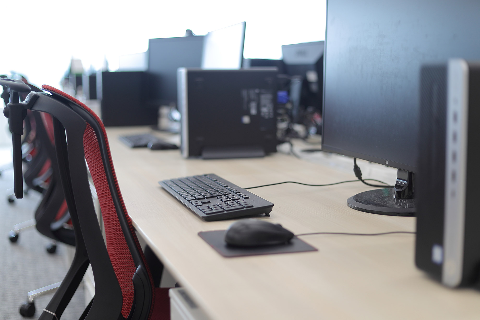 余計な書類は積み上げないクリーンデスク。在宅勤務も浸透して、出社率は50%程度。